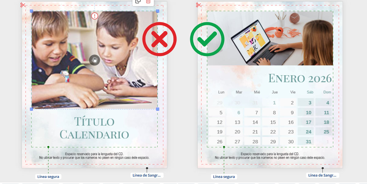 Otro error frecuente es no respetar los márgenes de seguridad ni el sangrado. Esto puede provocar que parte del diseño o de las imágenes se corten al guillotinar el calendario al tamaño final.