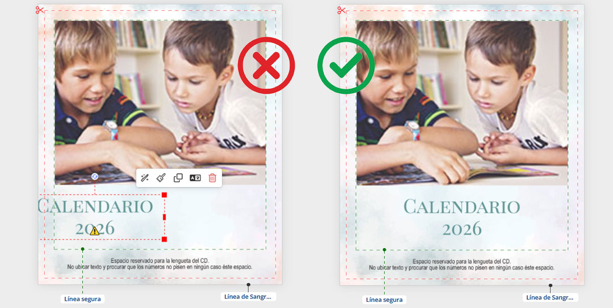 Para evitarlo, tienes que poner todo el contenido que no quieras que se corte dentro del recuadro delimitado por el margen de seguridad (Línea segura) que te indica nuestro editor online. También visualizarás la línea de sangrado delimitada por la línea roja, que te indicará el sangrado. Esa parte será la que guillotinemos para entregarte el calendario al tamaño final. En ese espacio, nunca pongas elementos que quieras que aparezcan en el calendario.