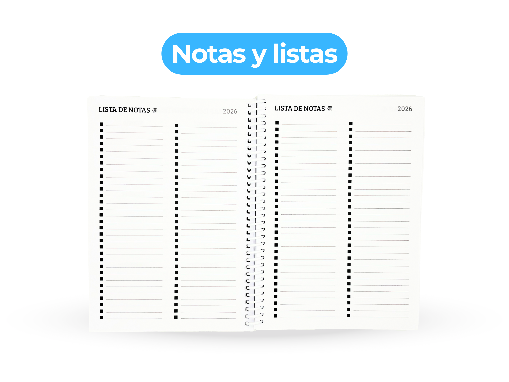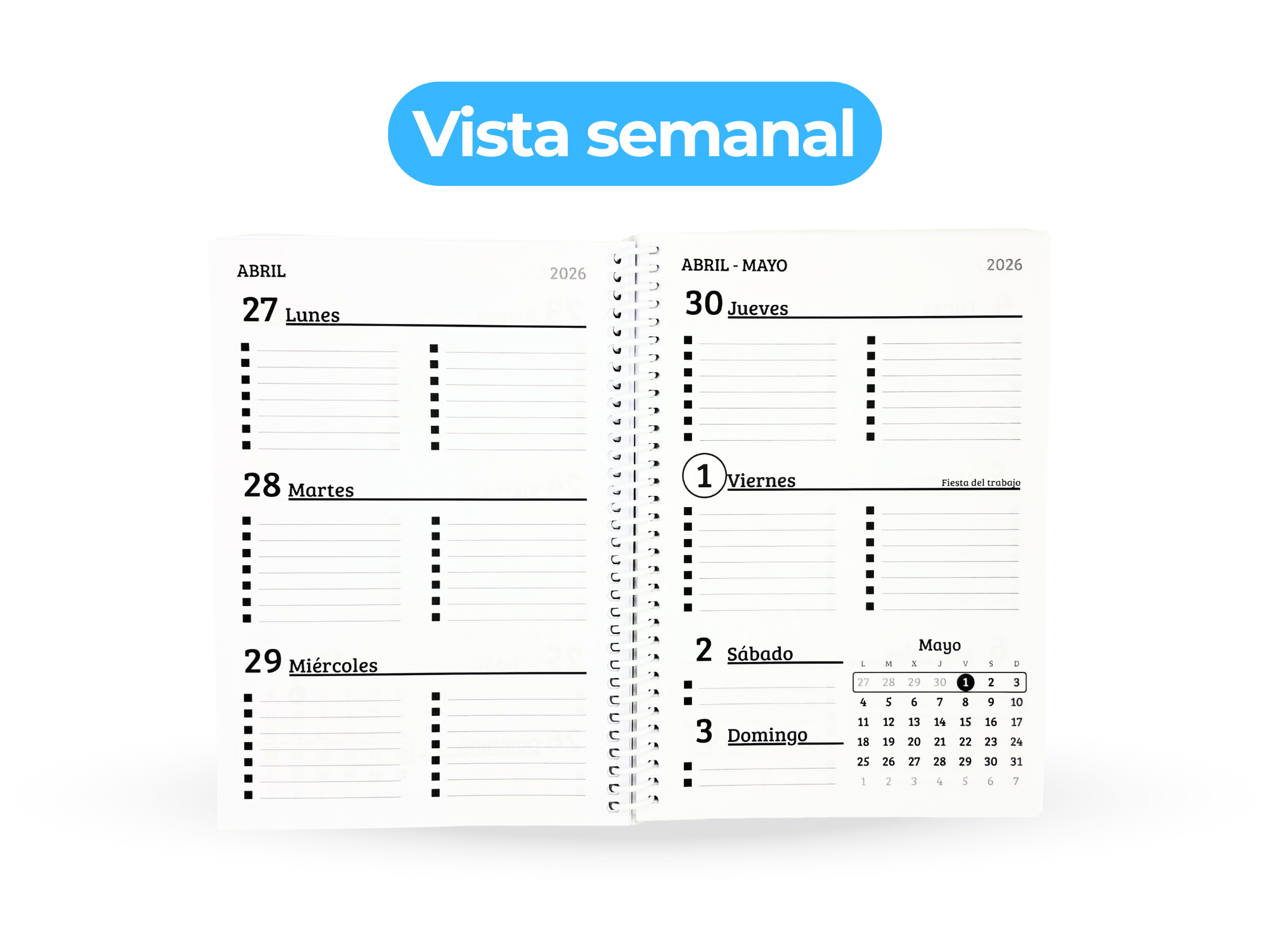 - Vista semanal con espacio para anotar tareas, notas y checklists cada día